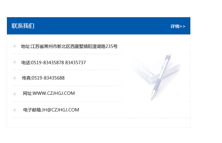 地址:常州市新北區友邦商務大廈1幢16、17層  電話:0519-85101652  傳真:0519-85112595  郵編:213022  網址:www_cz-jiayue_cn.izhenlian.com  郵箱:xiajifengaa@163.com